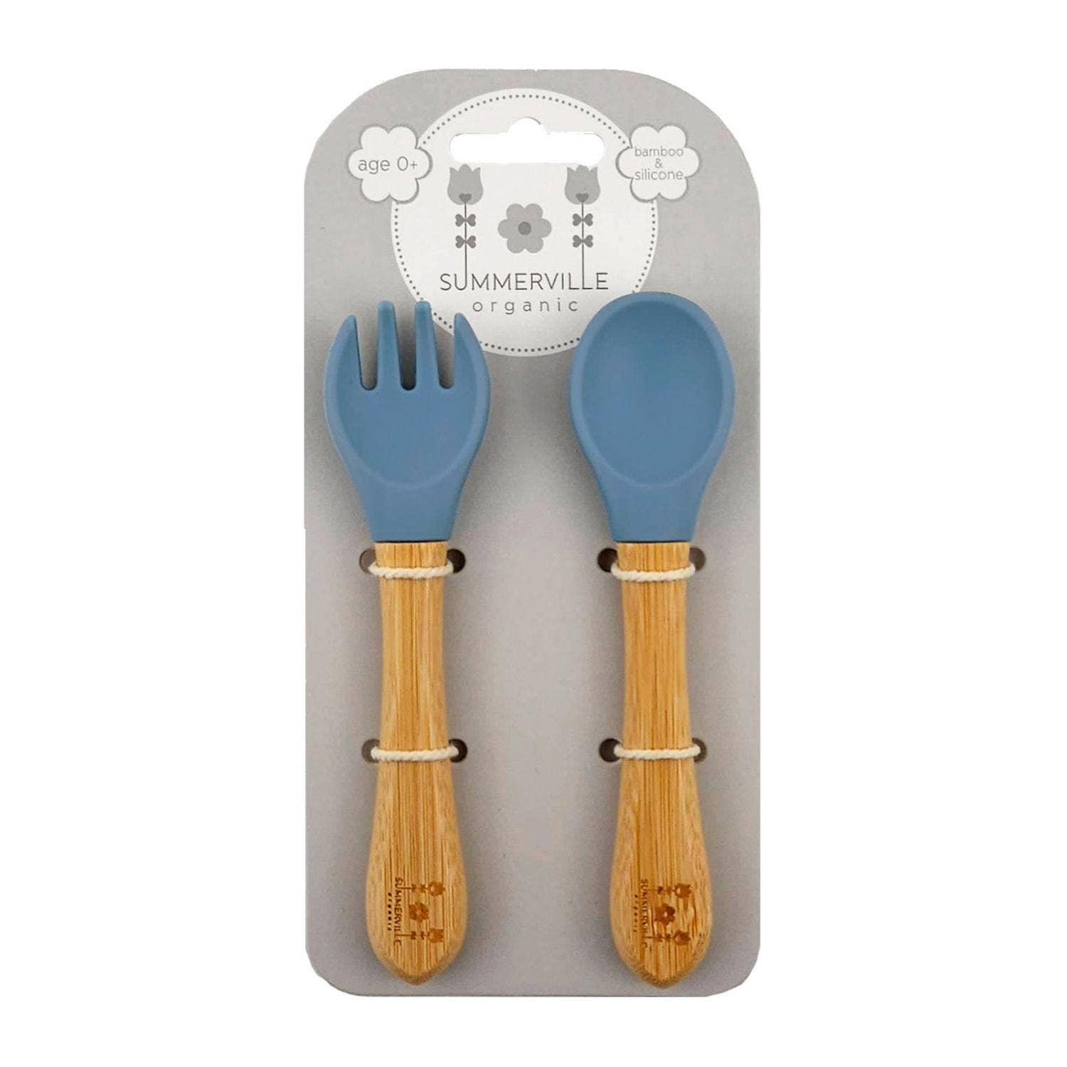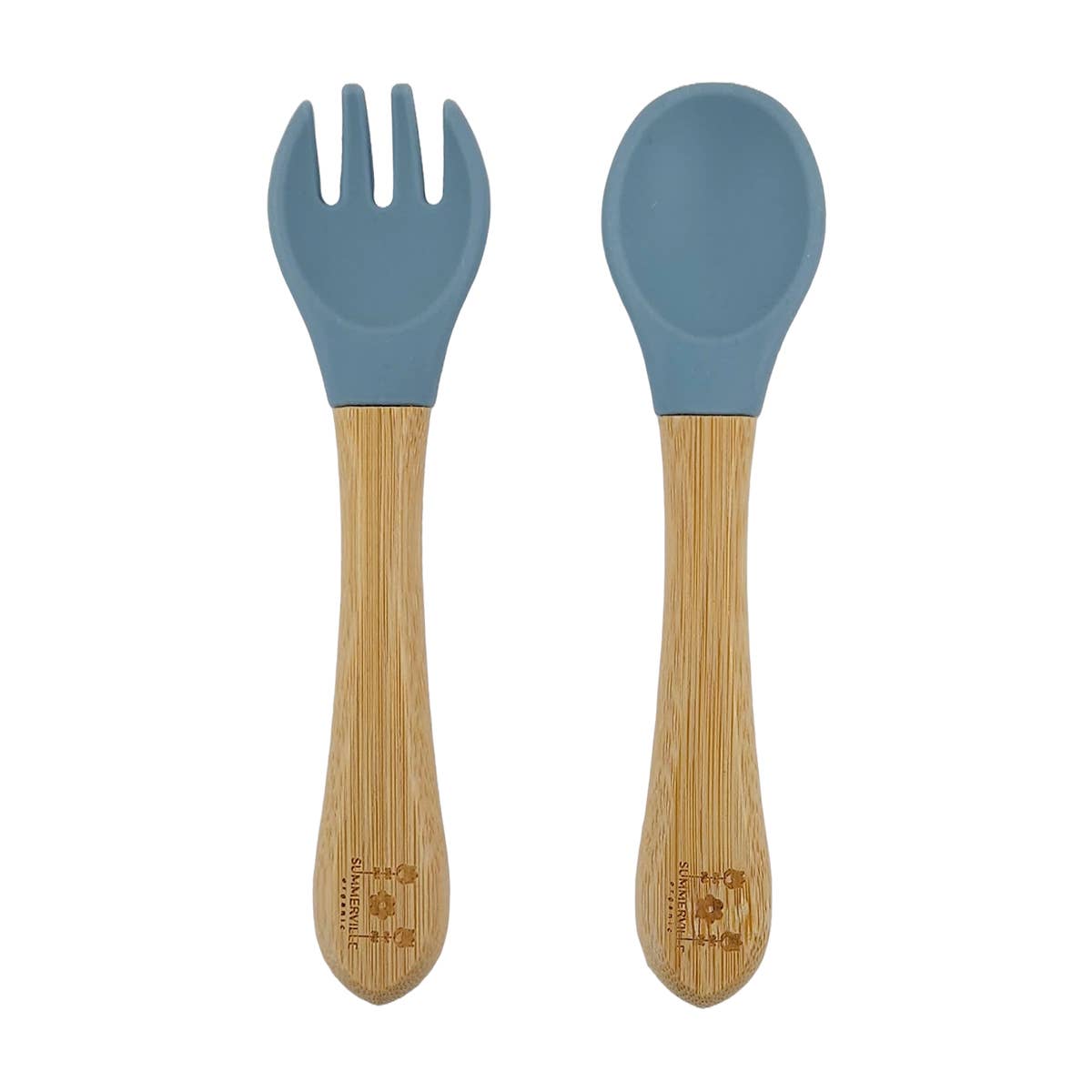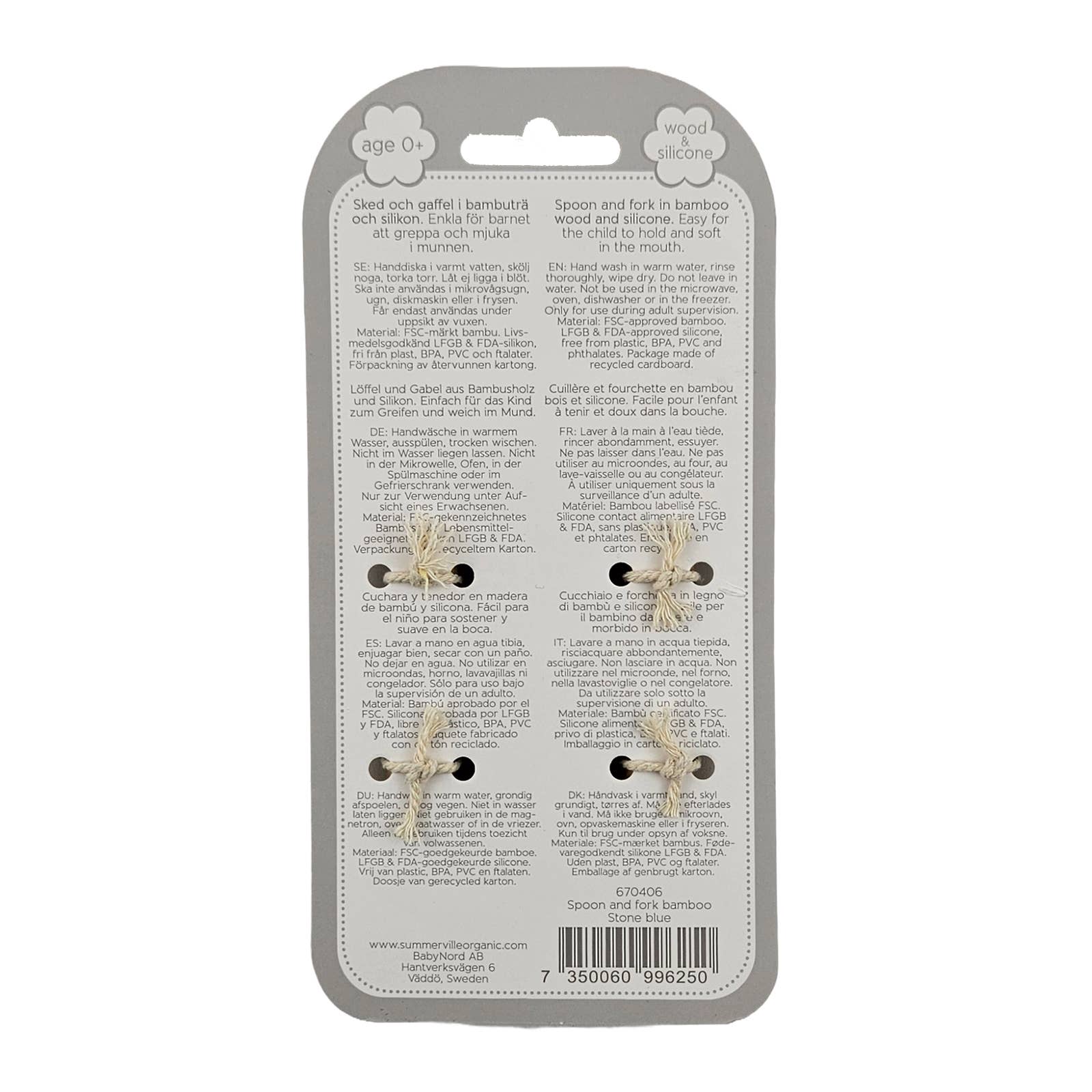 Dette søte skje- og gaffelsettet i bambus og silikon er perfekt til babyens første måltider! Bestikket er spesielt utformet for små hender, lett å gripe og behagelig å holde. Den myke silikonspissen er skånsom mot barnets tannkjøtt og munn, mens bambushåndtaket gir et naturlig og trygt grep.