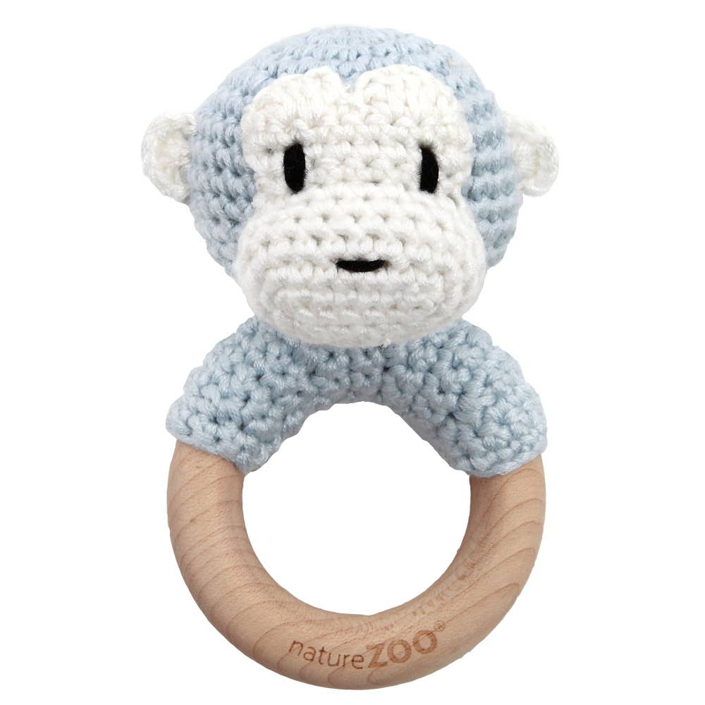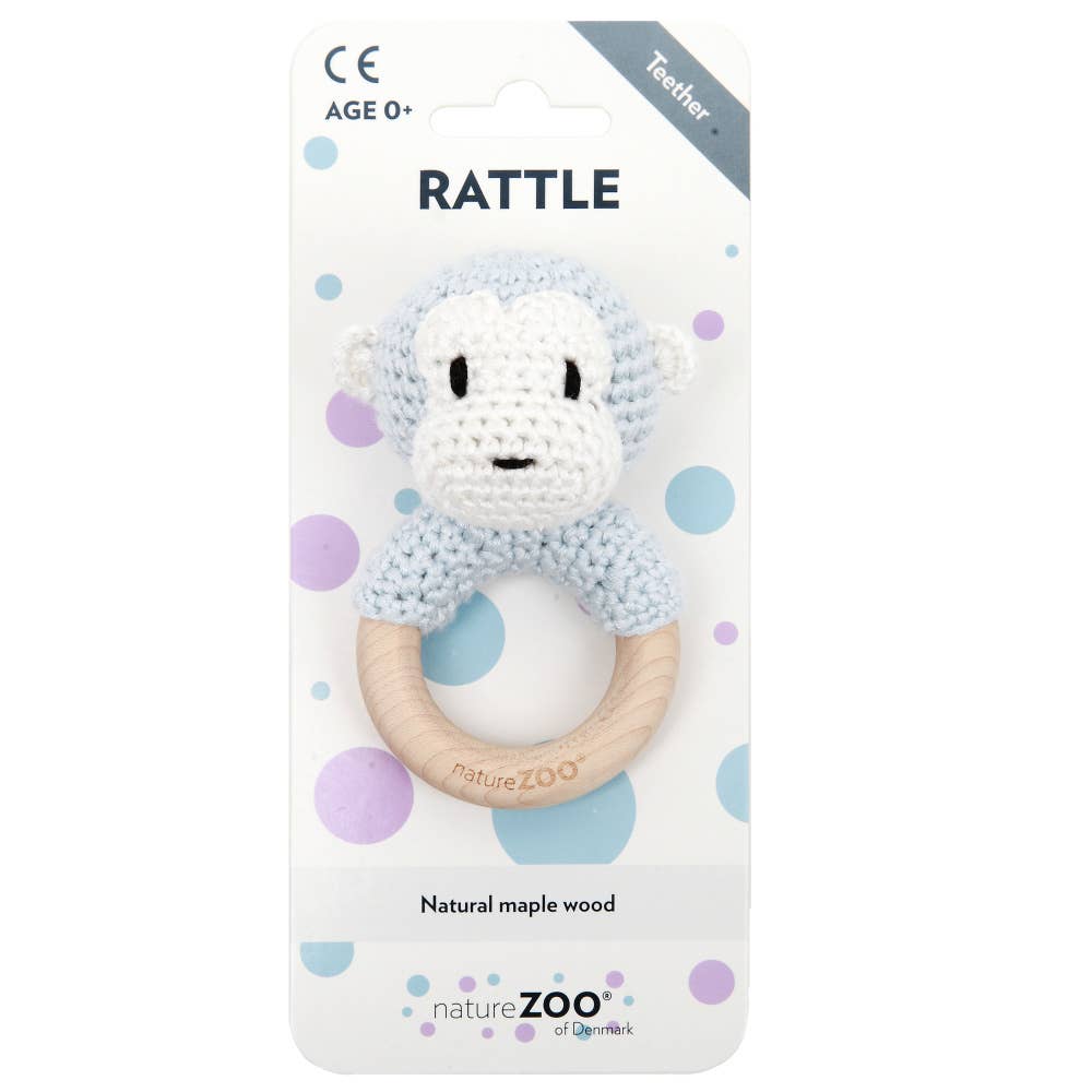 Høykvalitets rangle i tre (og bitering) med mange vakre detaljer. Den er laget av ubehandlet lønnetre, og det heklede elementet er håndlaget med mykt bambusgarn.