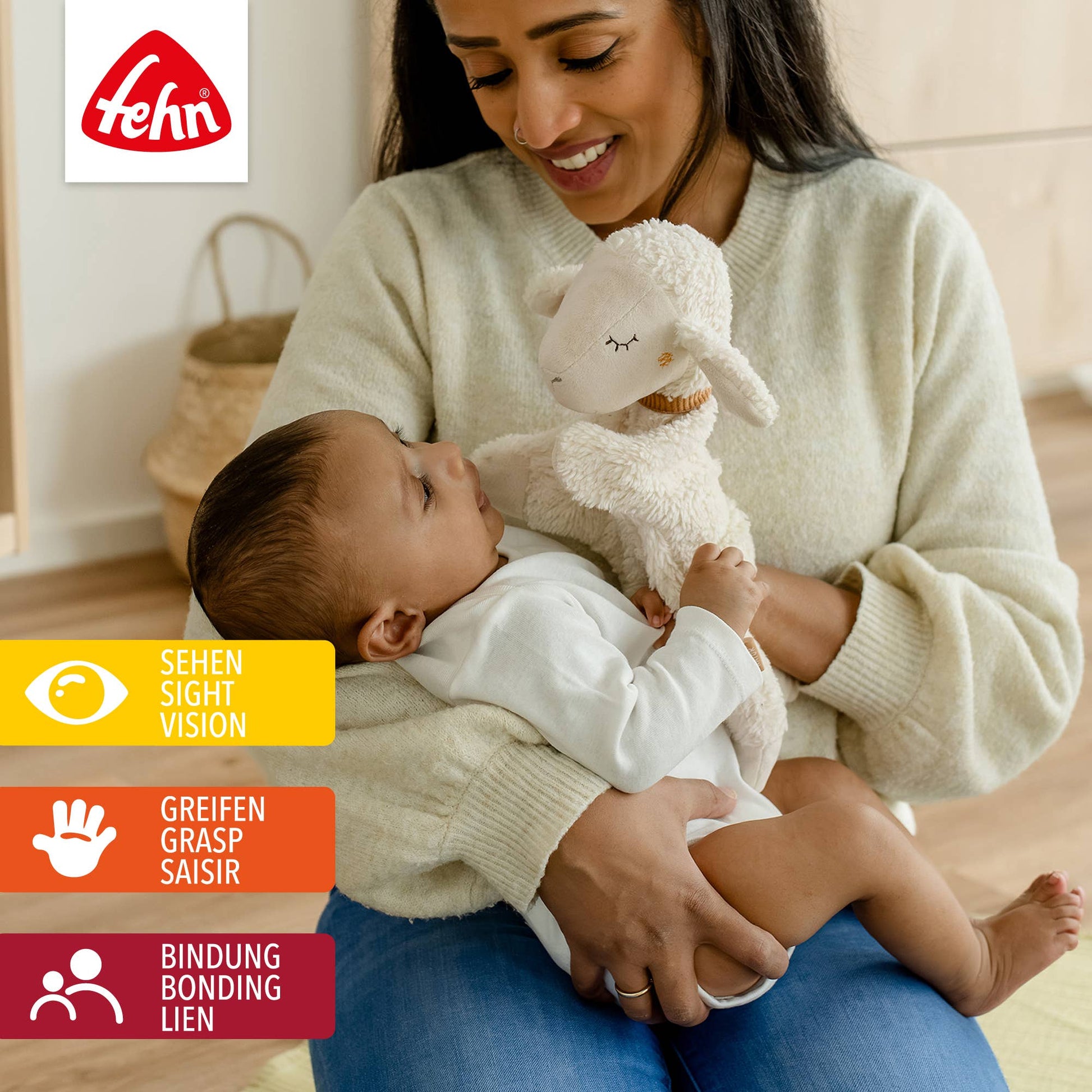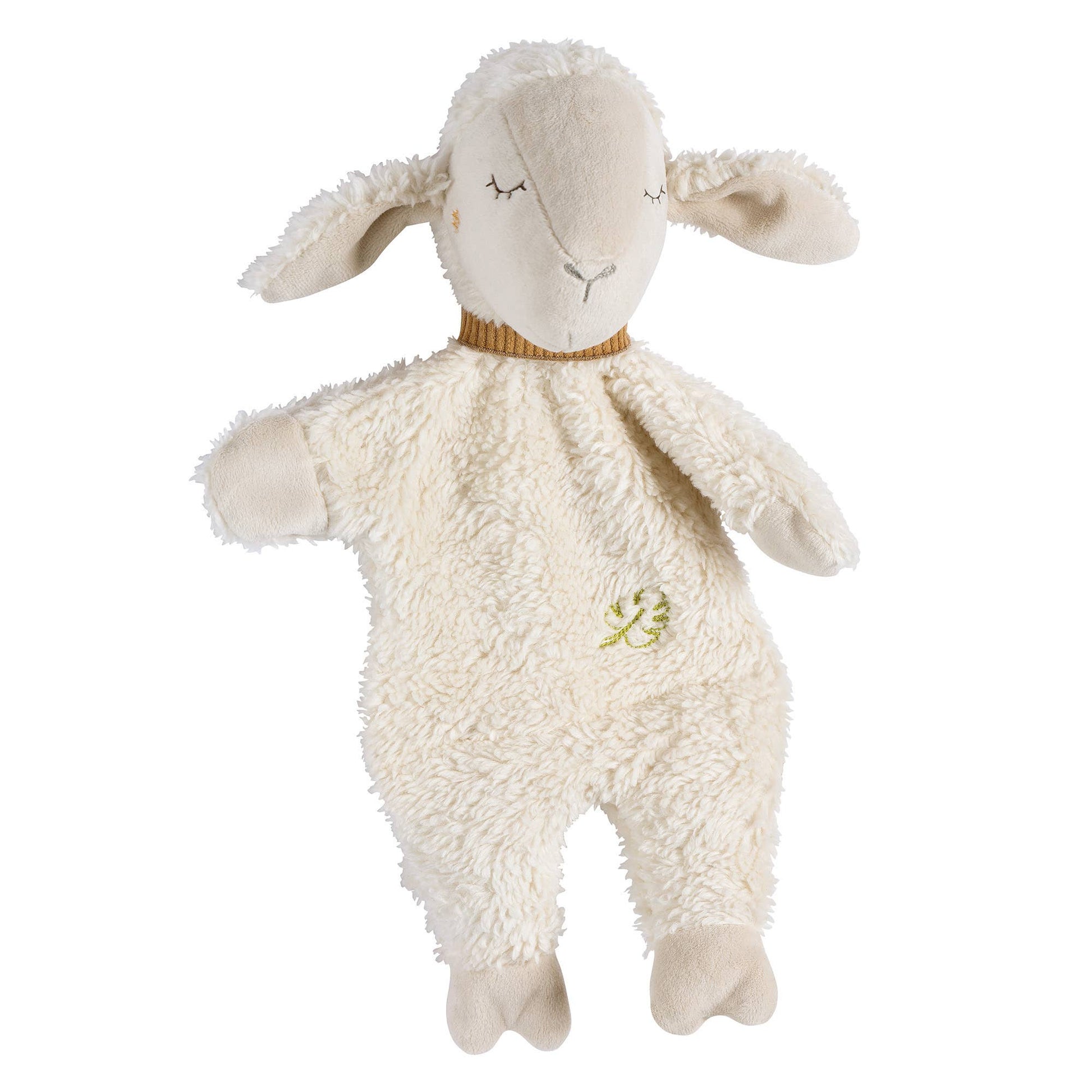 Den myke hånddukken skaper nær kontakt mellom foreldre, besteforeldre eller søsken og babyen. Om dagen inviterer de myke lagene og fyllingen av sertifisert økologisk bomull til å gripe, utforske og kose, slik at den lille sauen raskt blir uunnværlig.