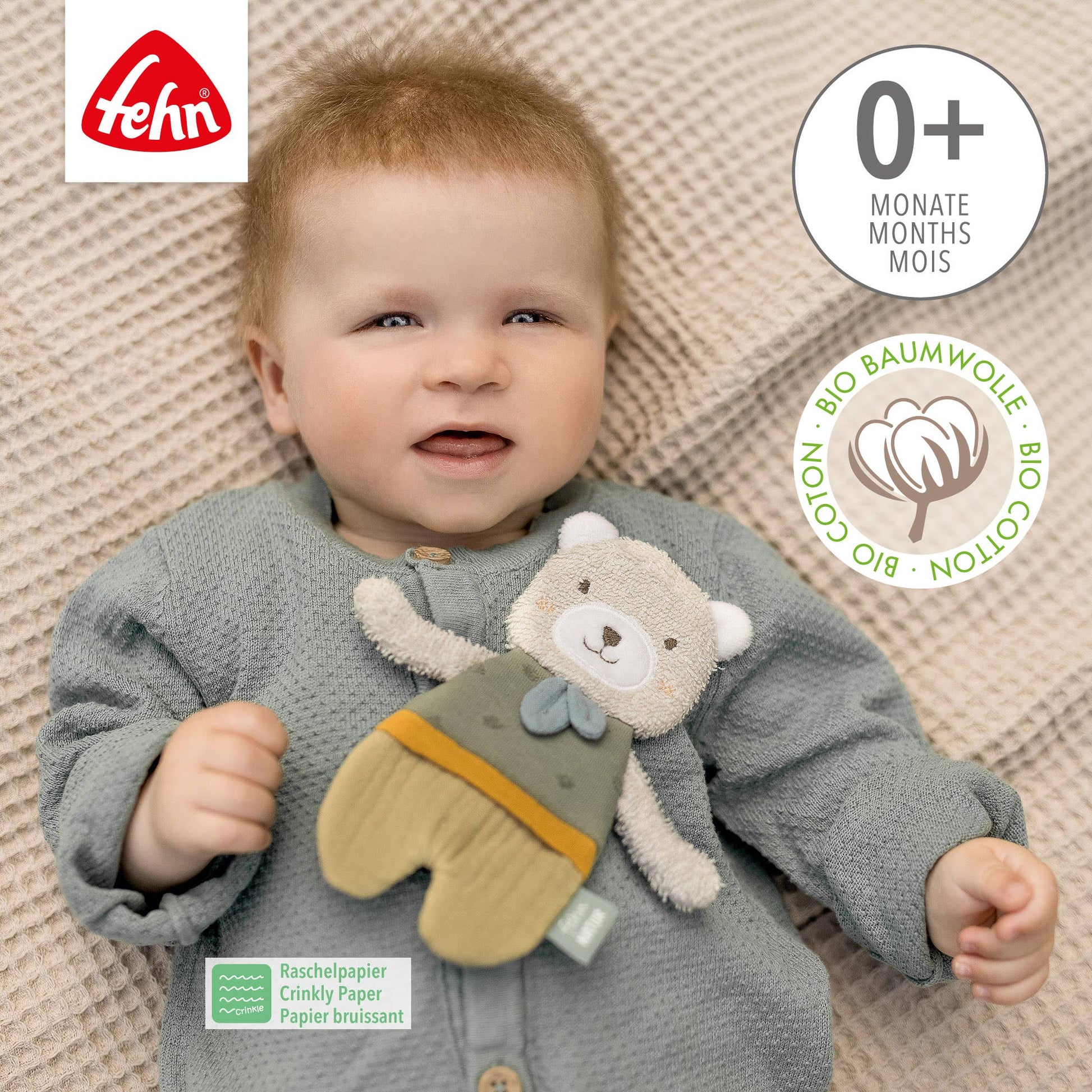 Ytre materialer i frotté, jersey, muslin og velour, laget av økologisk bomull (KBA), gjør leken ekstra behagelig. Den søte grønne bjørnen kan tas med overalt og følger babyen under lek og drømmer.