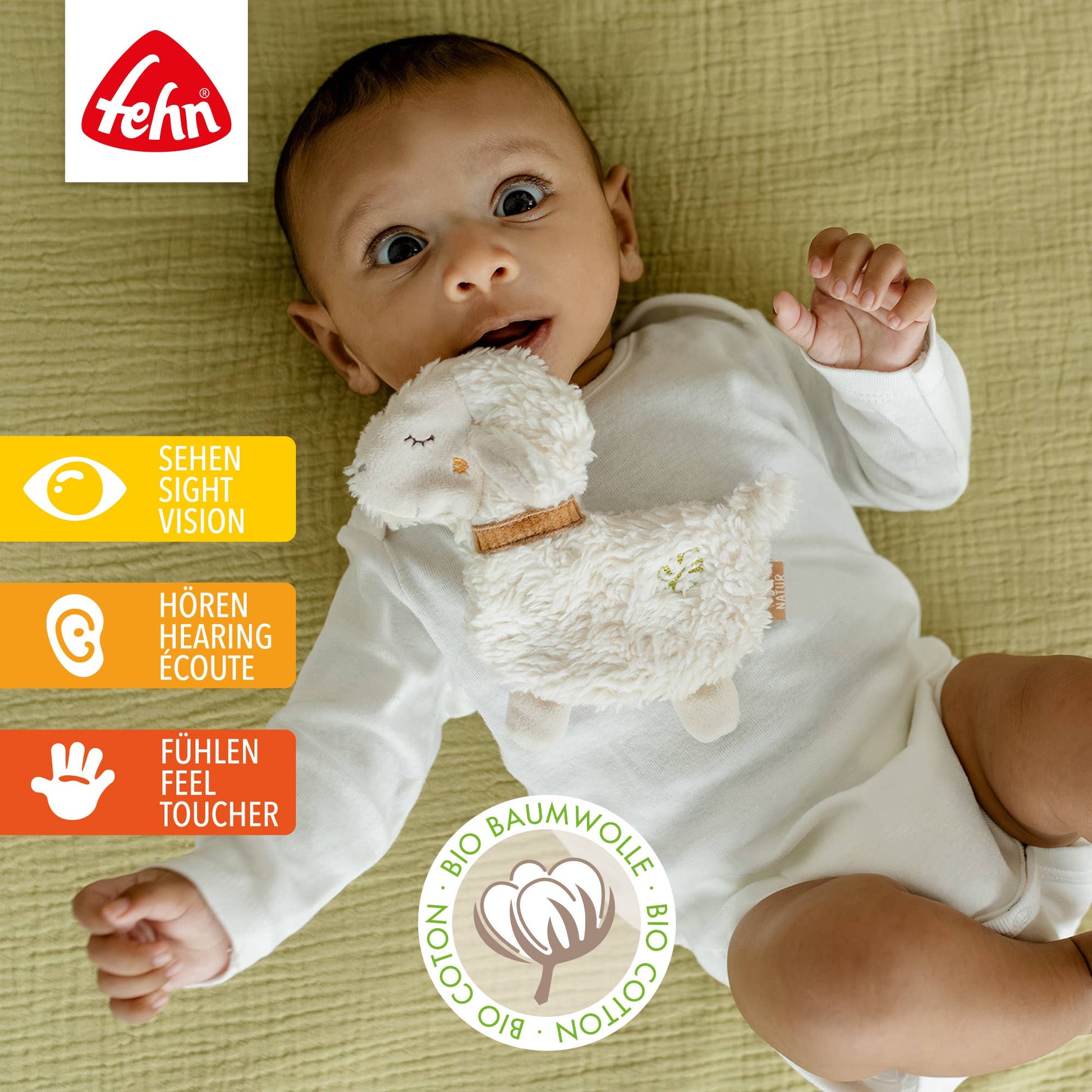 Denne søte knitresauen fra FehnNatur® stimulerer lekent babyens sanser og støtter motorisk utvikling. Med spennende lyder fra det skjulte raslepapiret blir leken aldri kjedelig. Babyer elsker formen på den myke stoffsaue – perfekt for å gripe, utforske og kose.