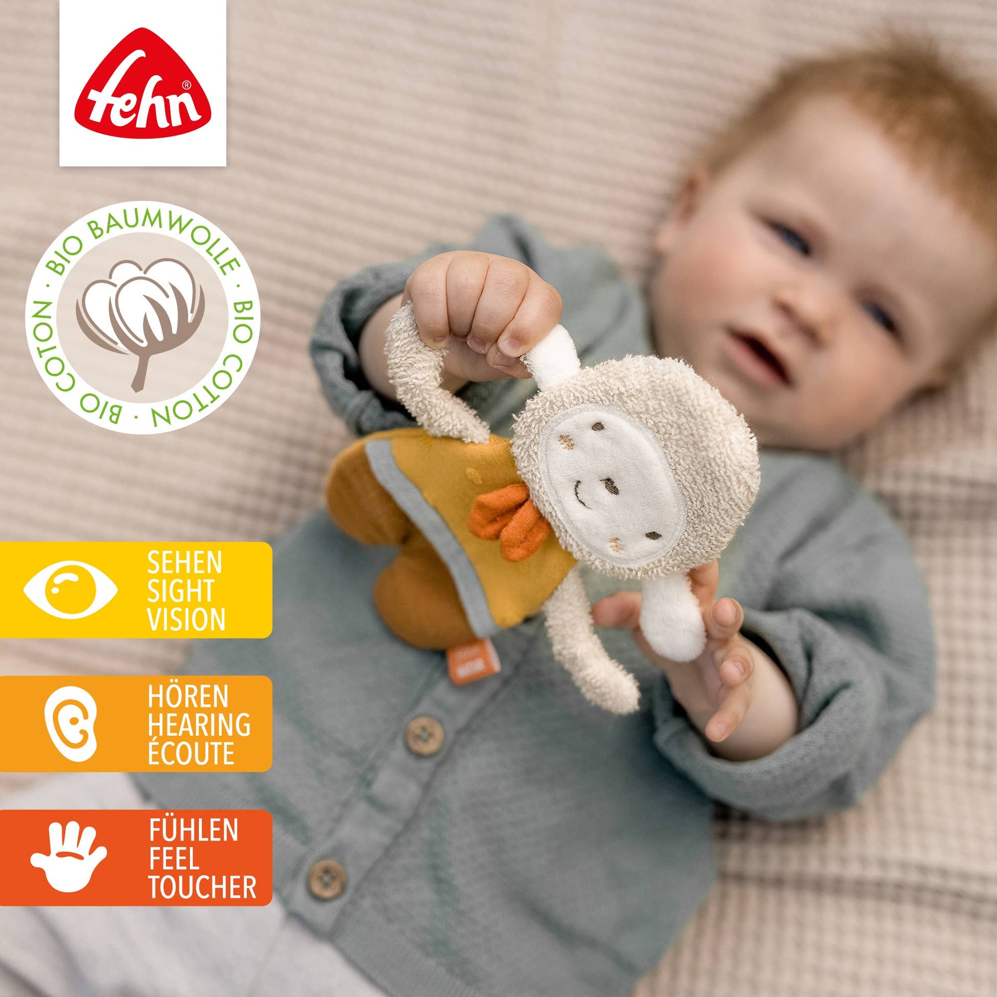 Ytre materialer i frotté, jersey, muslin og velour, samt fyll av økologisk bomull, gjør leken ekstra behagelig. Den søte gule sauen kan tas med overalt og følger babyen under lek og drømmer.