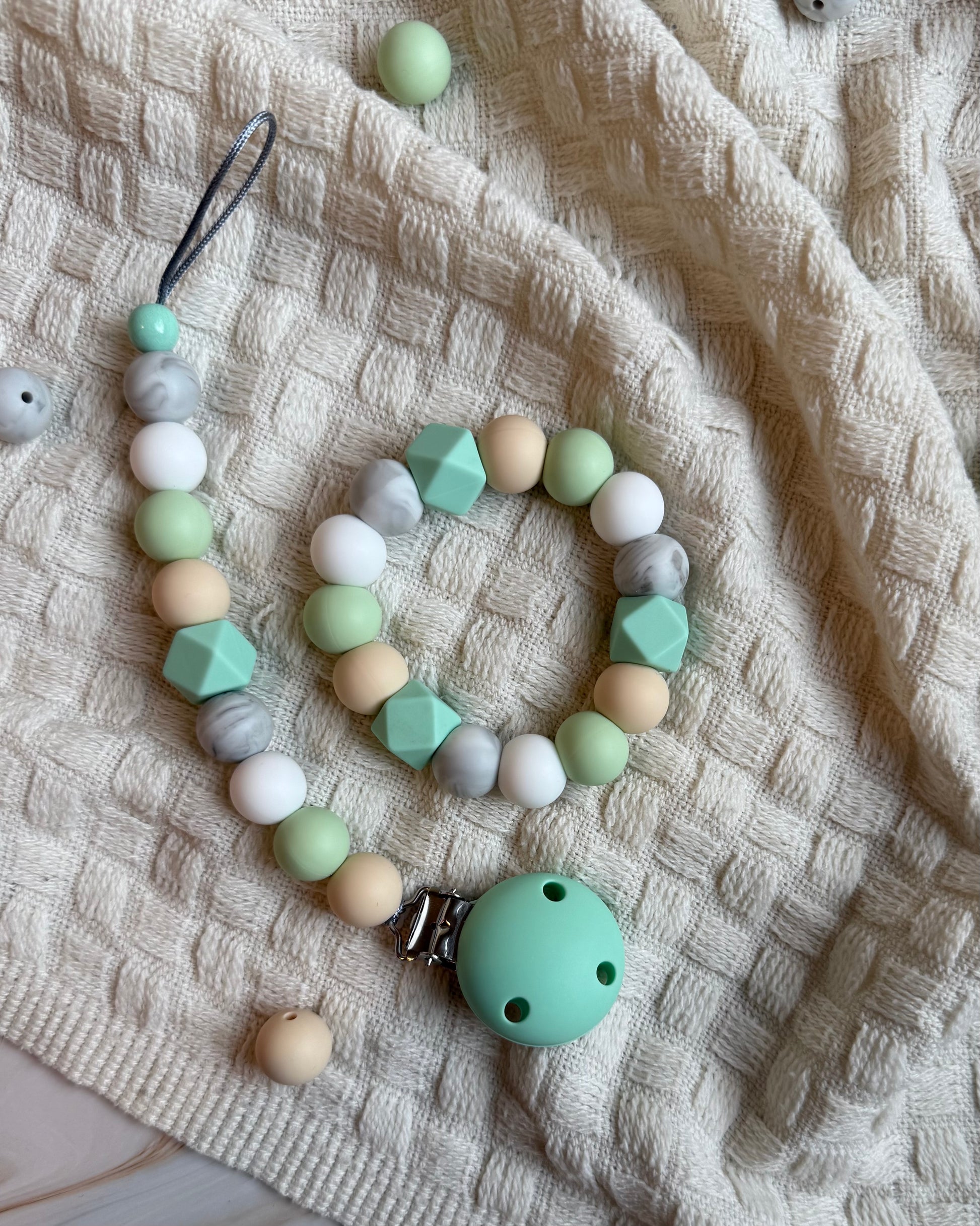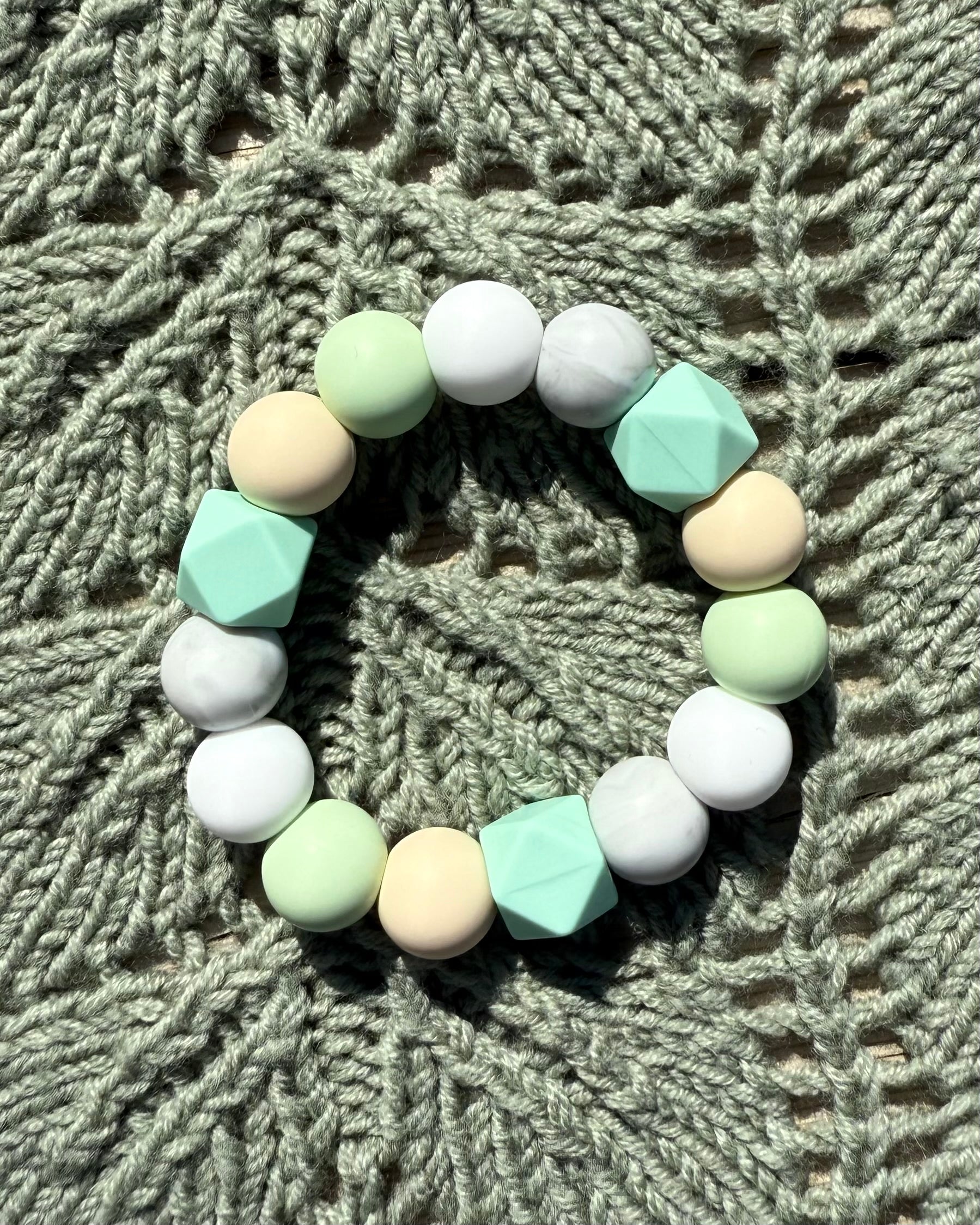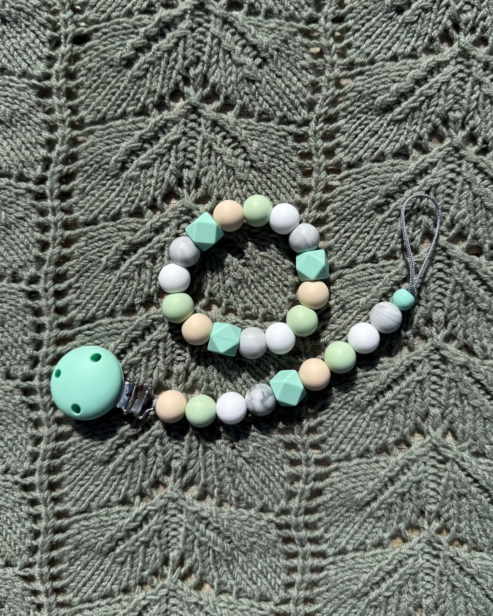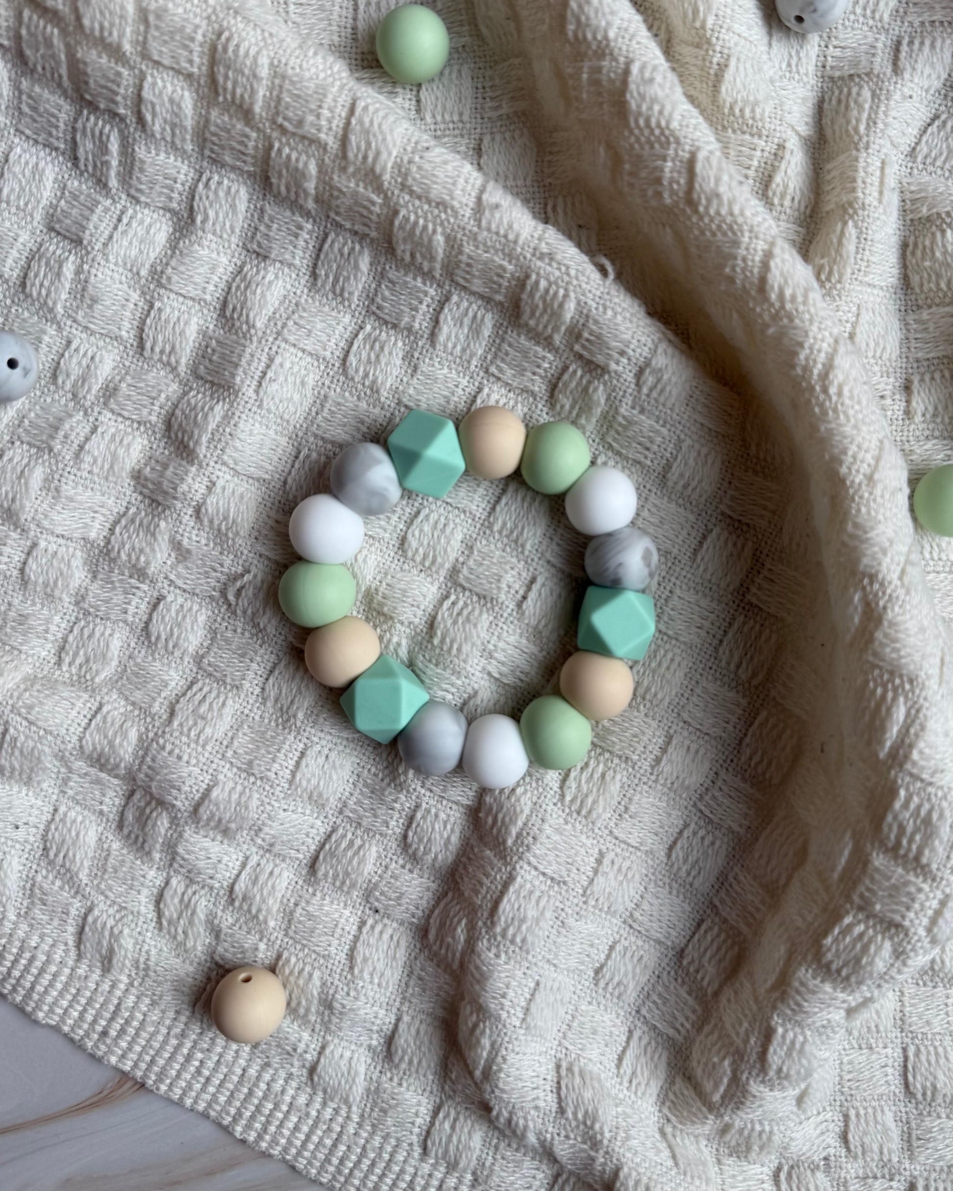Gi babyen din en trygg og lindrende opplevelse med vår håndlagde bitering laget av BPA-frie silikonkuler og solid nylontråd. Perfekt for små babyhender, og ideell i den krevende tannfrembruddsperioden.