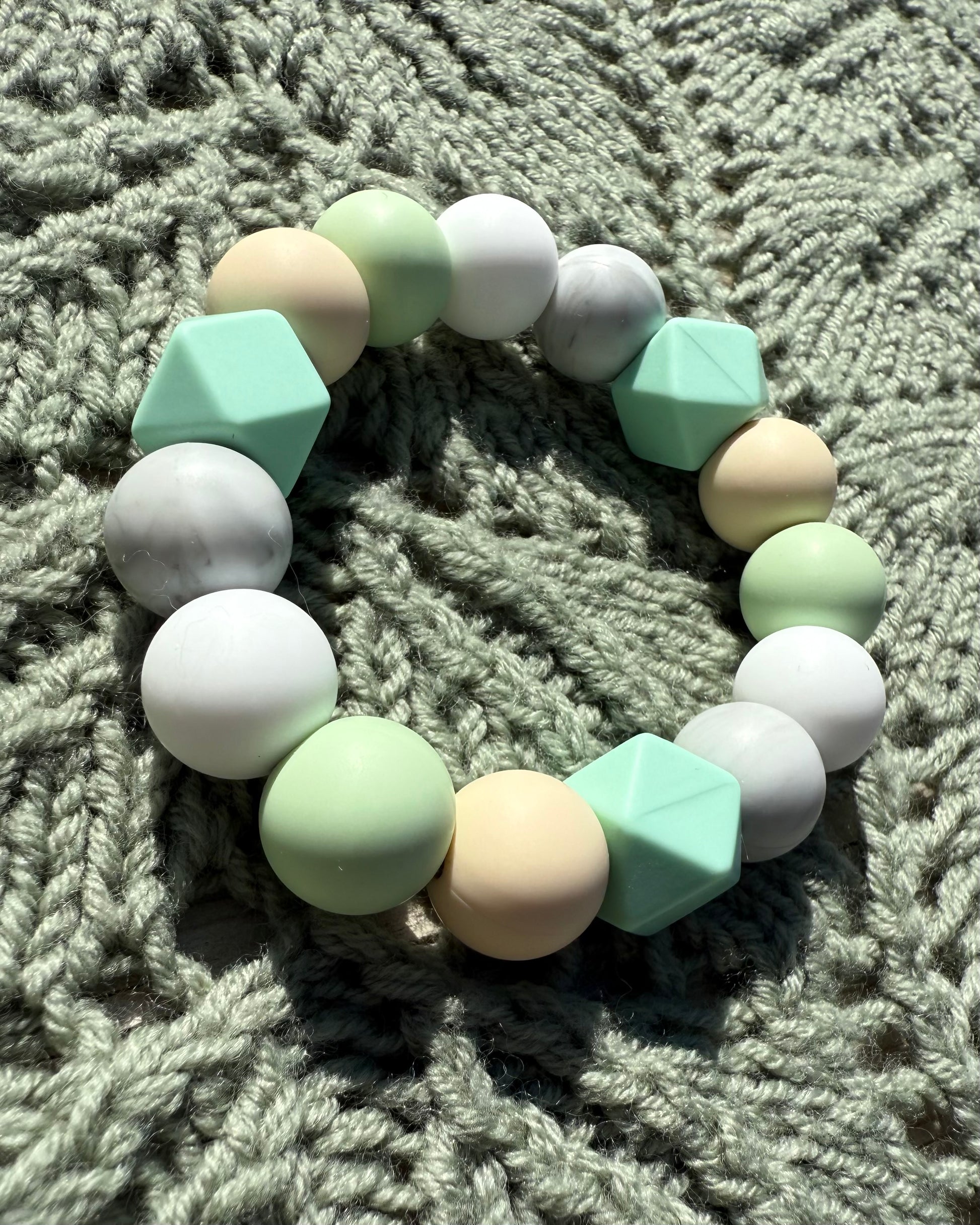 Bitering laget med 100% giftfrie og BPA-frie silikonperler. 15mm rundperler og 14mm heksagonperler. Perlene er kjøpt hos minlillehobby.no. Perlene er testet både fysisk og mekanisk på et akkreditert laboratorium, og er bitesikre.