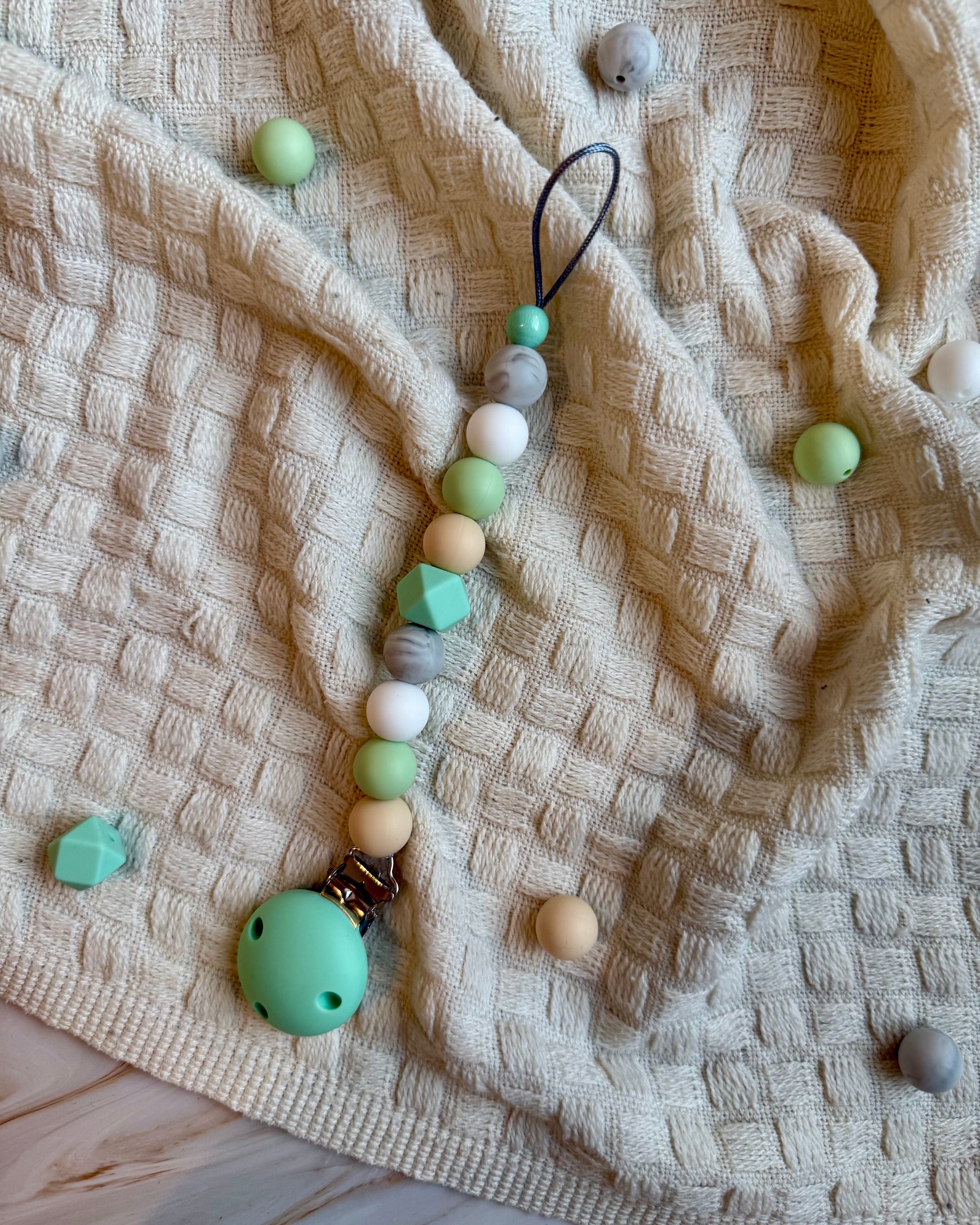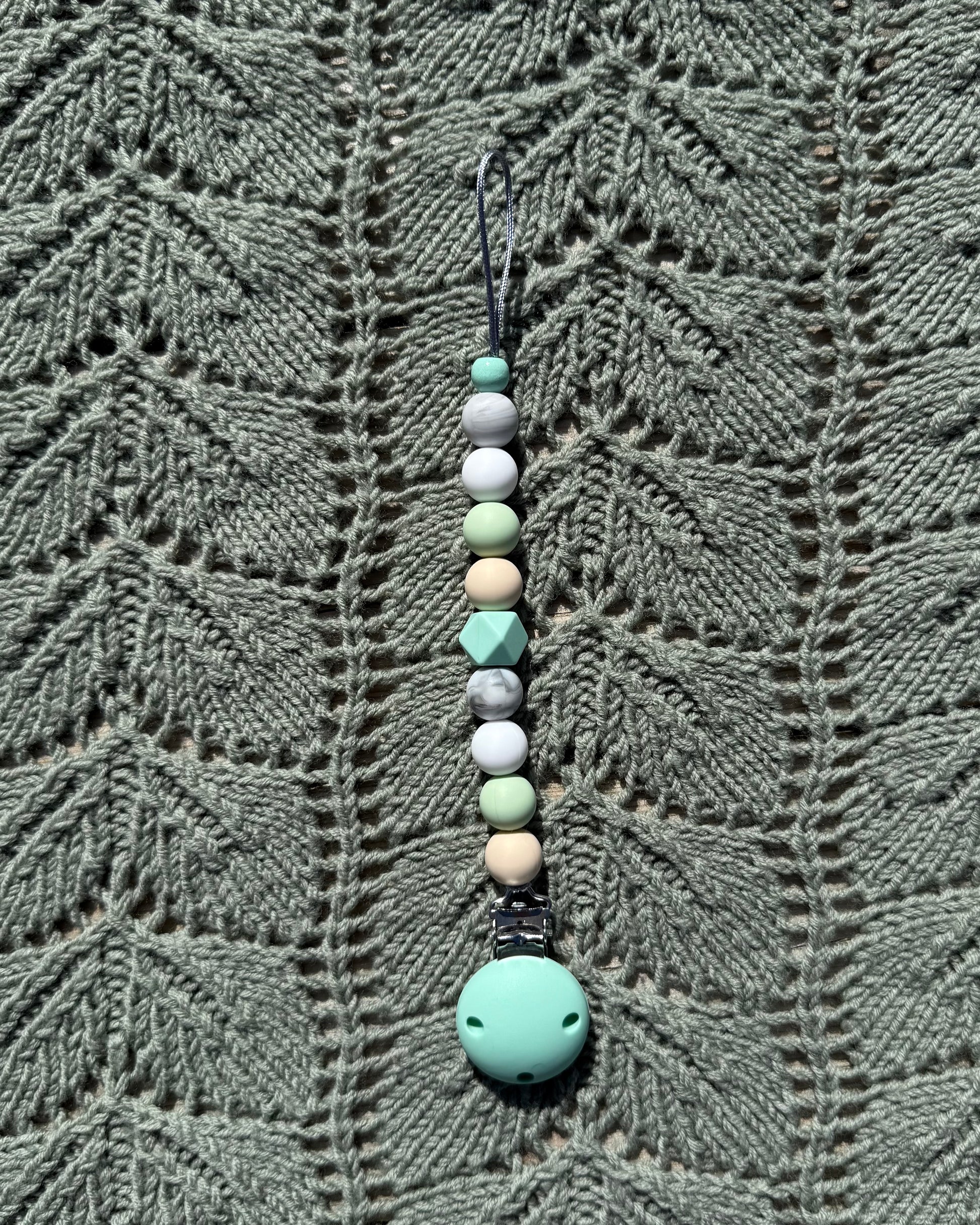 Hold smokken eller siteringen innen rekkevidde med denne håndlagde smokkelenken. Laget med BPA-frie silikonperler og slitesterk nylontråd. En trygg og praktisk løsning som hindrer at smokken faller på gulvet.