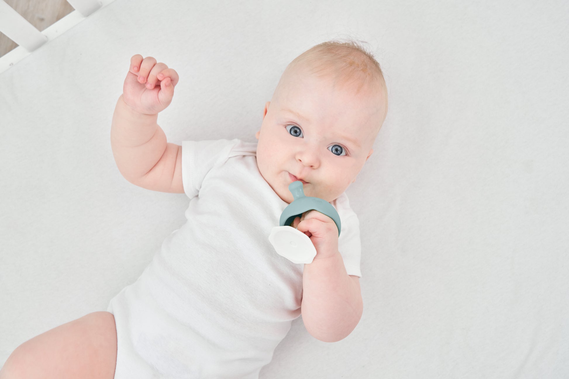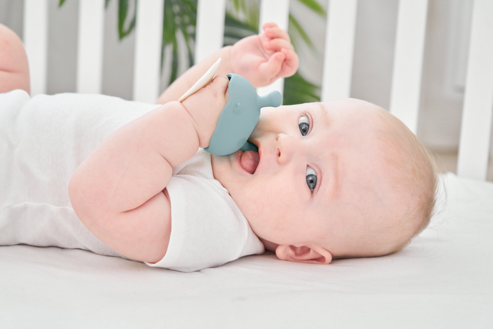Hjelper til med å lindre den første smerten og kløen i gommene, før de første tennene kommer. Samtidig som den forhindrer tommelsuging/håndtygging. Holder seg i barnets hånd når de sovner, og lett tilgjengelig når de våkner.