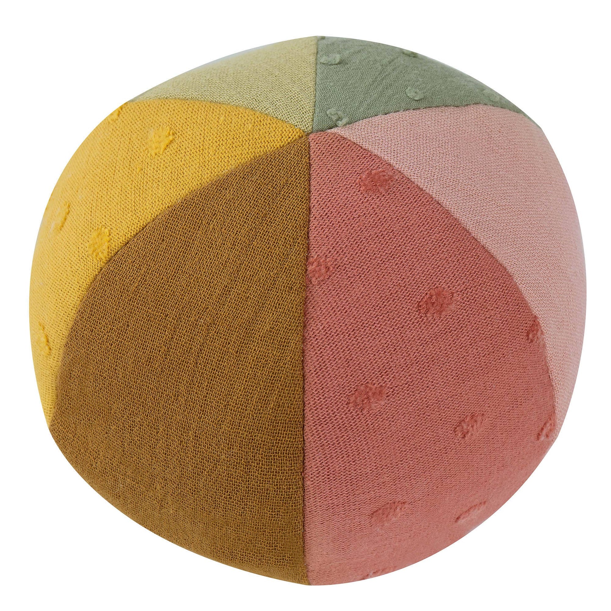 Ytre materialer i muslin og jersey samt fyll laget av økologisk bomull gir spennende teksturer som stimulerer sanser og inviterer til å gripe, utforske og leke. Sammen med den lille stoffballen blir leken aldri kjedelig, perfekt for hjemmebruk eller på farten.