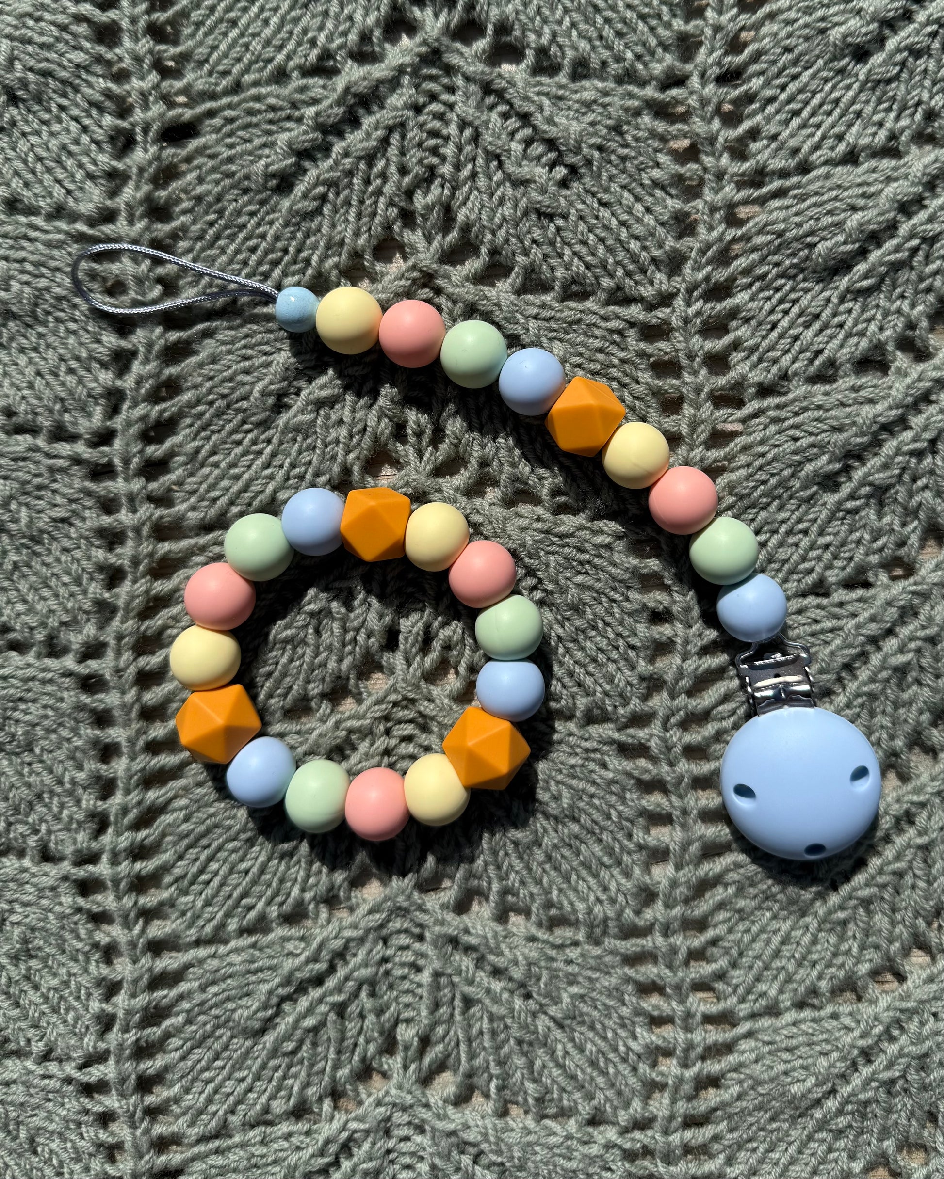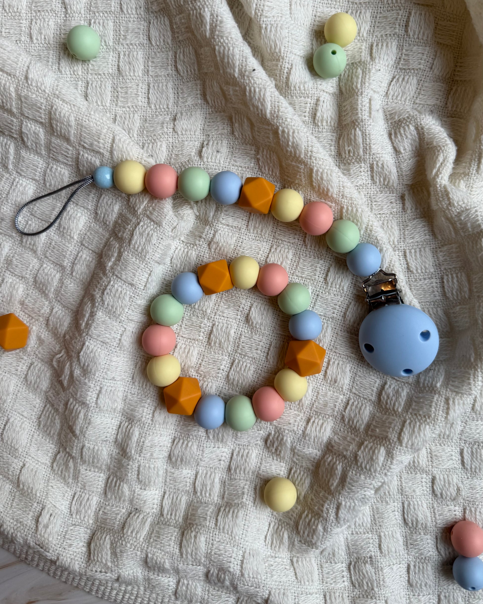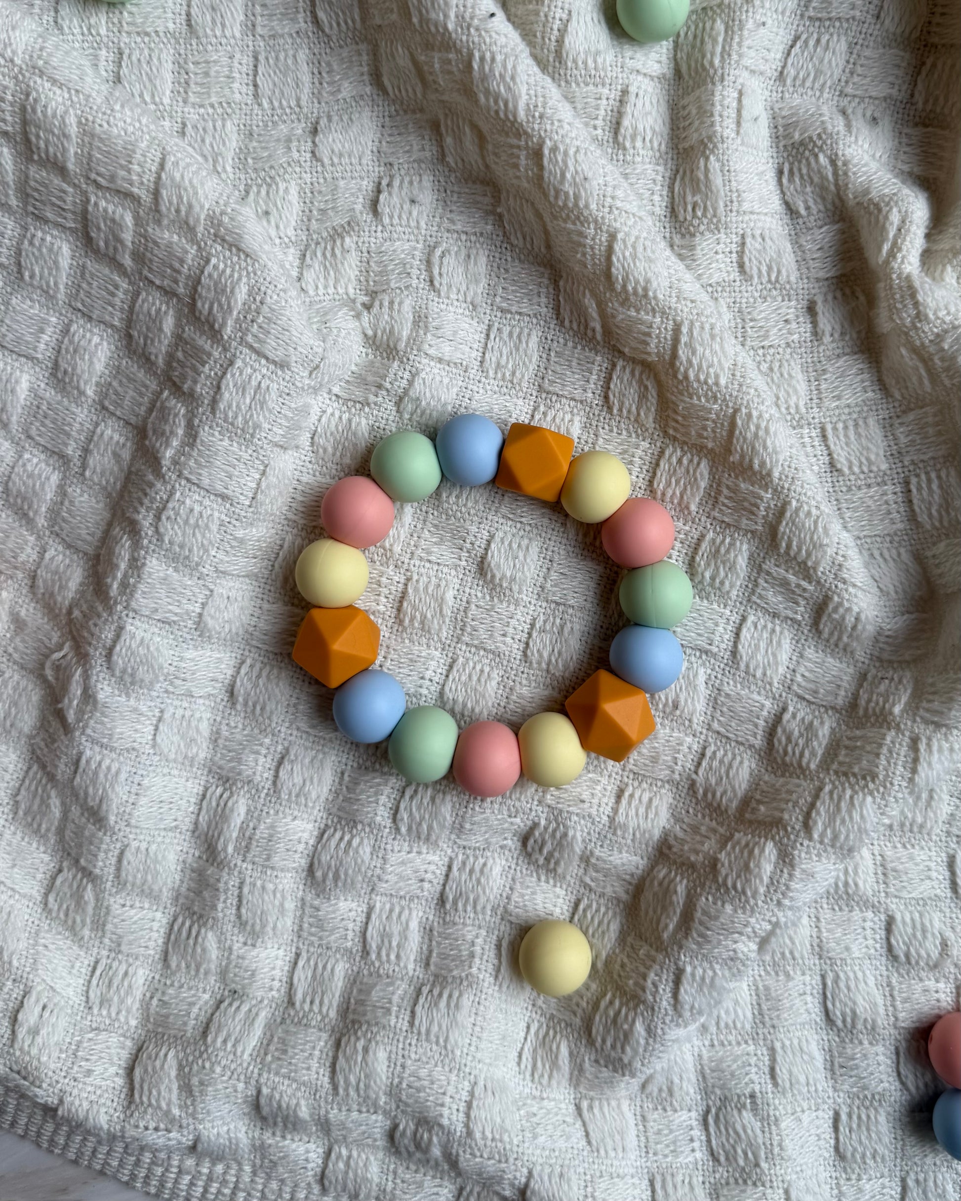 Gi babyen din en trygg og lindrende opplevelse med vår håndlagde bitering laget av BPA-frie silikonkuler og solid nylontråd. Perfekt for små babyhender, og ideell i den krevende tannfrembruddsperioden.